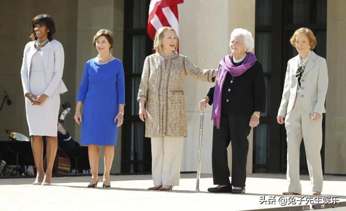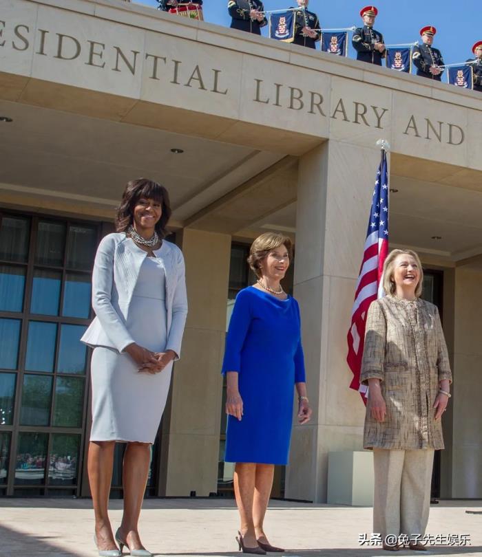 在2013年,乔治·布什总统中心在美国德克萨斯州的达拉斯建成,当时的第一夫人米歇尔·奥巴马以及前几任美国第一夫人都共同参加,他们站成一排,依次是米歇尔、劳卡、希拉里、芭芭拉和罗莎琳。当时现任的第一夫人米歇尔身材高挑,站在左边第一排的位置,双手放在身前,显得谦逊又有礼仪。