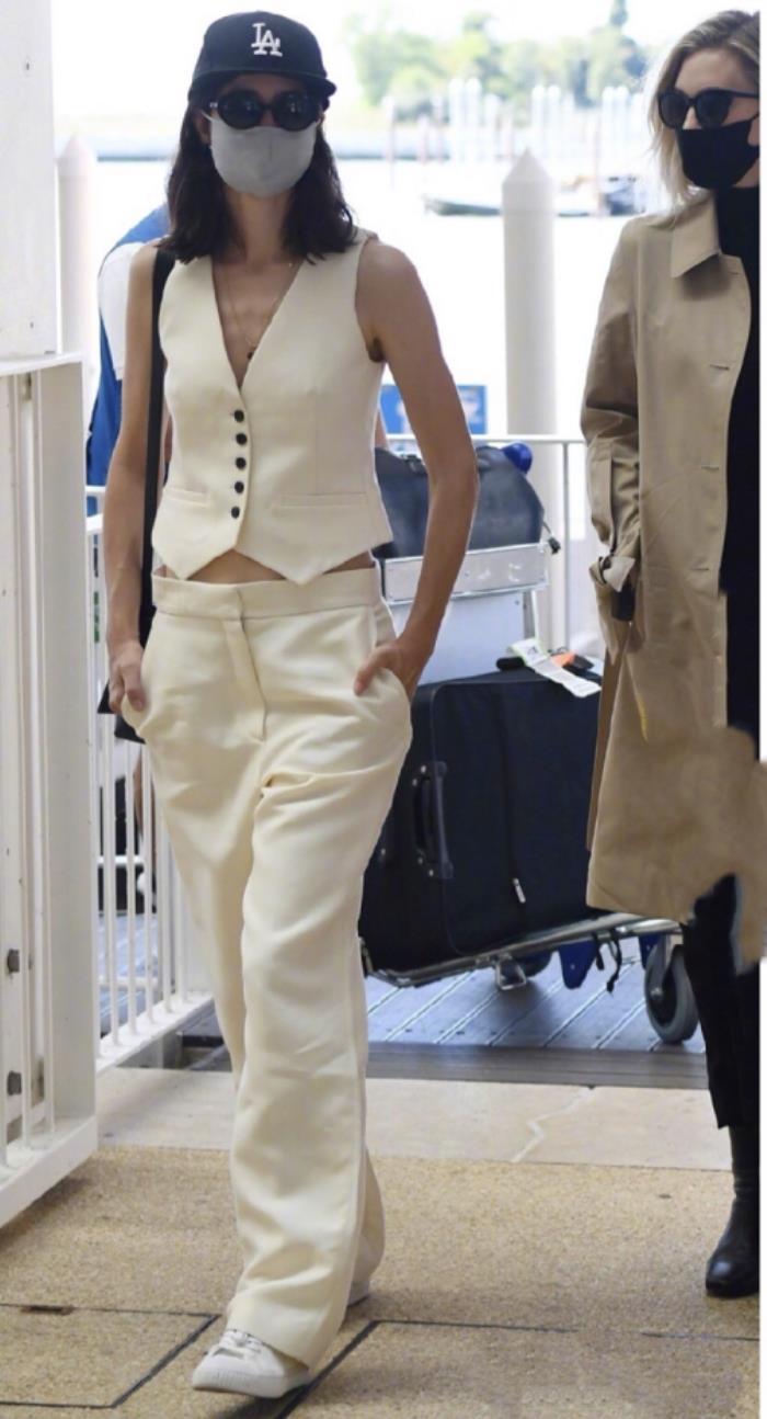 这是一套非常简单的的职场搭配,看上去就像是一个主攻事业的大女主,非常的率真干练。身上则是穿着一套米白色的西装,里面搭配的一件西装的马甲,将马甲全部扣起来,全身的衣服裤子都是出自The Row的2020年秋冬新款,脚下则是搭配一双同品牌的黑色底透明的凉鞋,看上去也是非常的干练。