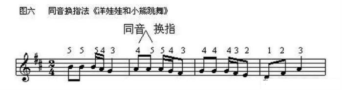 出于对乐句流畅的要求,需要扩大两指之间的距离时所采用的指法,如图四。