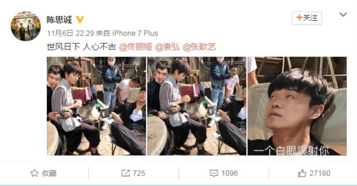 近日,陈思诚微博上发了一组片场照片,自己的老婆佟丽娅坐在另外一个男演员袁弘的大腿上。陈思诚称:世风日下 人心不古 ,还直接@了佟丽娅,袁弘以及袁弘的老婆张歆艺。所发的图片里还有张翻白眼的图片:直接加字“一个白眼震射你”。