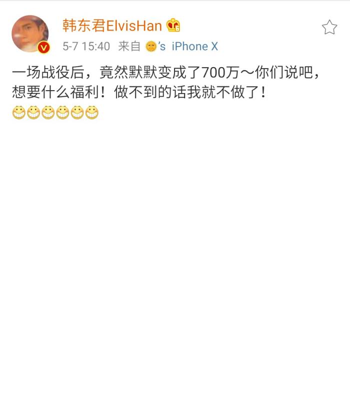 还差1万就到啦,四舍五入也可以算700万吧,韩东君也是没谁啦!也正是这么搞笑,才让很多人喜欢吧。那现在也应该想想700万粉丝福利咯,说不定过一会就到啦,甚至更多哦