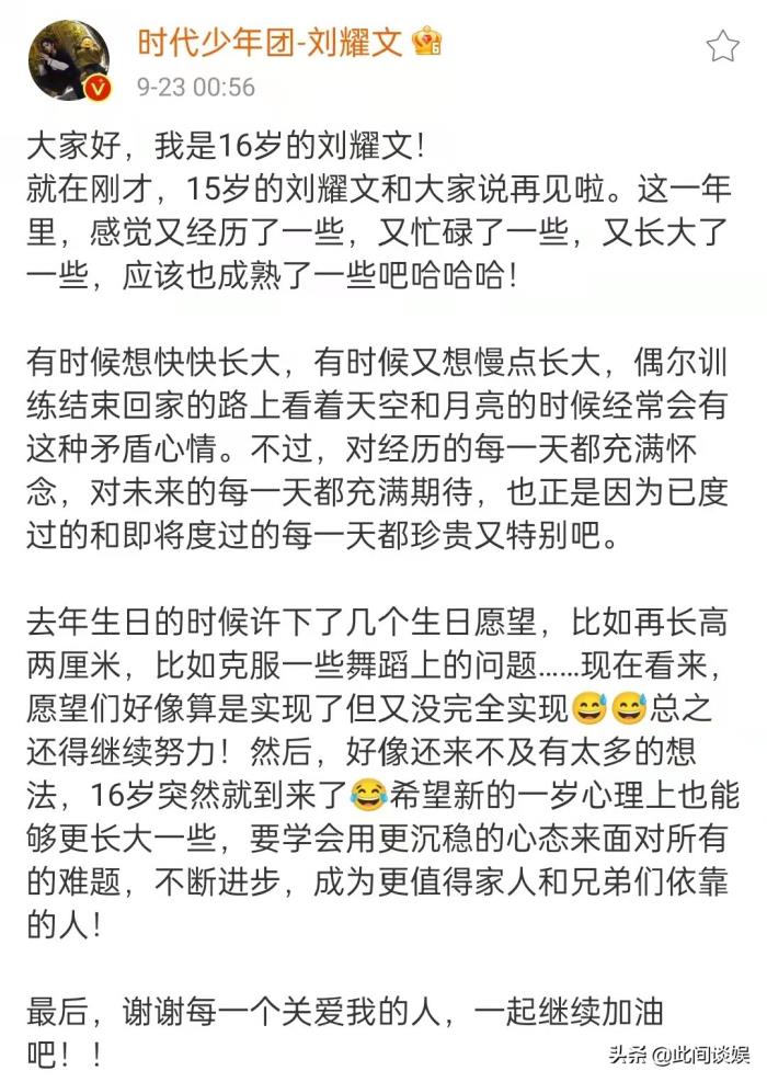 刘耀文在凌晨发文与粉丝分享跨入十六岁的喜悦,字里行间尽是“孩子气”和过分的成熟,这并不冲突,比如自己想长高,想克服舞蹈上面的问题,想快快长大,感谢爱自己的人等等,男孩的愿望很简单,很纯朴,却也有着野心勃勃,能感受到他作为一名艺人对于自己的严格要求。