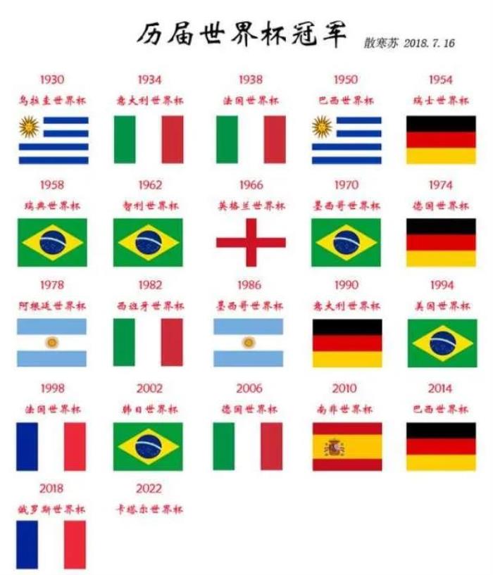 在世界杯90多年的历史当中,共诞生了8个冠军,分别是乌拉圭、意大利、德国、巴西、英格兰、阿根廷、法国和西班牙。最近一次的新王加冕还是在2010年的南非世界杯中,西班牙队凭借稳健的传控足球第一次获得了世界杯冠军,成为新王。而之后两届世界杯冠军分别为德国和法国,均为旧王。