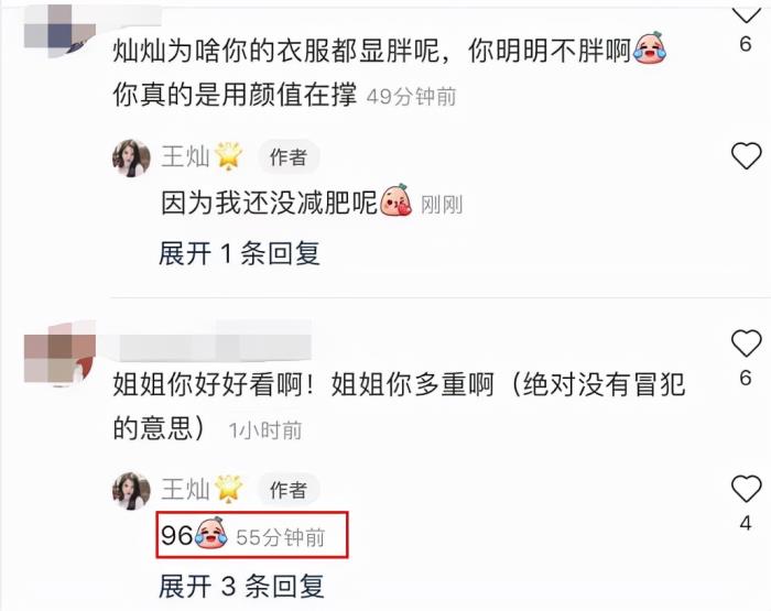 随后现身评论区与网友互动的王灿,她还大方公布了自己现在的体重,王灿透露自己现在有96斤,而且,因为在哺乳期,所以并没有特意减肥。