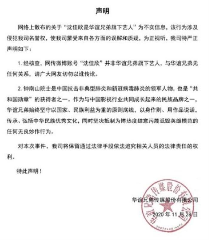 11月28日晚,华谊兄弟在社交平台发声明,表示网上关于“沈佳欣是华谊兄弟旗下艺人”为不实信息,沈佳欣与华谊兄弟无任何关系。并表示对于此次事件,将保留通过法律手段追究的权利。