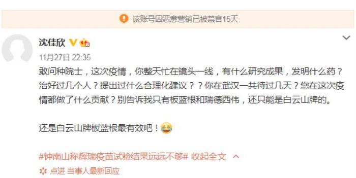 网易娱乐11月29日报道近日,网络用户沈佳欣在社交平台发言,公开质疑钟南山院士,言辞令人愤怒,目前该用户已因恶意营销被禁言15天。