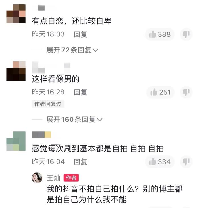 就这么一段自拍的视频,在王灿的评论区里,网友们却尽显吐槽,说王灿有点自恋,还比较自卑。更有网友说这样看王灿,看上去像一个男的。朋友们的评论也太新奇了,王灿对于网友们的评论,也是积极的回复,并且各种怼网友,自己的社交账号自己做主,想拍什么就拍什么。