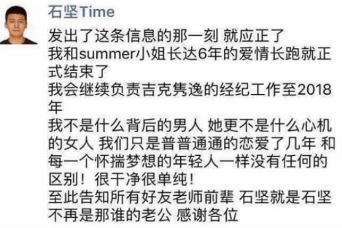和吉克隽逸相恋6年的前男友名字叫做石坚,也是她的经纪人。