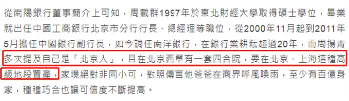 之前就有传言,周扬青父亲是某企业老总。但近来又有网友爆料,周扬青爸爸疑似是某银行的副行长、董事长周载群。