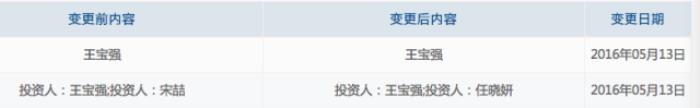 以宝亿嵘影业为例,今年3月25日,宝亿嵘影业投资人由马蓉和任晓妍变更为王宝强、任晓妍、宋喆,王宝强妻子马蓉退出投资人名单中。今年4月19日,宝亿嵘影业投资人再次发生变更,变更后,宋喆、任晓妍退出,王宝强为唯一自然人股东。