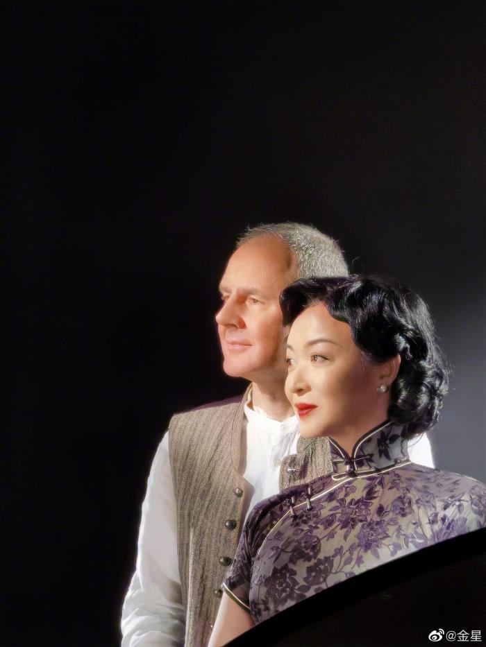金星晒出的第一张照片,她身穿中国传统服饰旗袍,搭配复古手推波纹发型,仿佛一位民国大小姐,极致优雅。金星身旁的汉斯一头白发,两人注视着远方,照片非常有故事感!