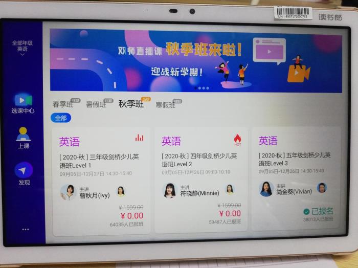 新学期开始,孩子就在学习读书郎双师直播课《秋季班》课程,每周末开课,双师教学,主讲老师不乏清华北大哈佛大学毕业老师,上课还有学分红包、课堂PK,孩子上课可有激情了。特别是陈露花老师主讲的《初一阅读写作菁英班》,他写作这方面有点弱,我都不用额外给他报班学写作文了,这个课很不错,我从平板的课程入口看到有超33000名学生报名这个课程。