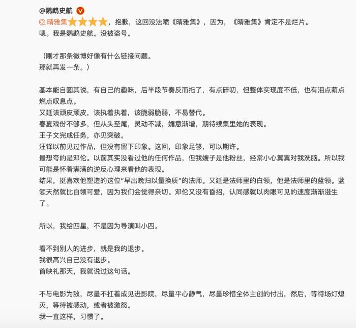 某眼的用户评价更倾向演员,对电影的评价略少。说完两大平台的用户评价,再说下知名影评人史航老师对电影的观感。