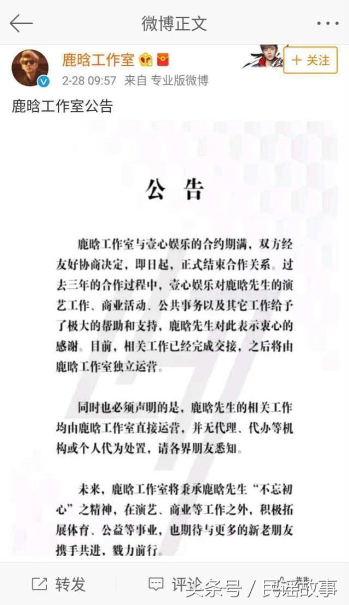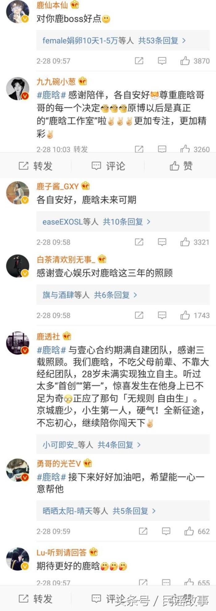 其实,芦苇们不用担心。这次是鹿晗与壹心娱乐合约期满,结束合作关系。相关工作目前已完成交接,自2018年2月28日起,鹿晗工作室将独立运营,并且积极拓展公益、体育等事业。