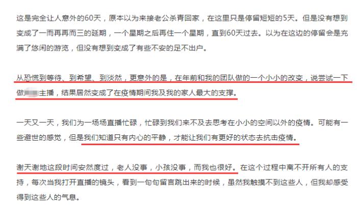 在酒店的60天,朱丹是从恐慌到等待、到希望、到淡然,好在年前和团队做了决定尝试做主播,结果没想到却成了疫情期间一家人最大的支撑,她非常感谢观看她直播的人,在特殊时期给了她温暖和力量,也让她忙碌到无暇去思考空间以外的事。