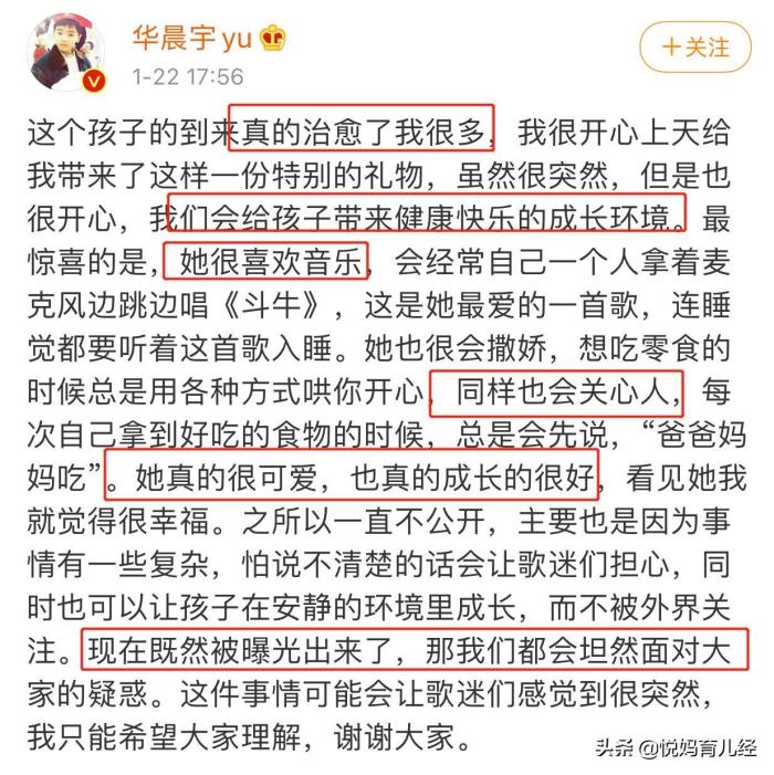 华晨宇在社交平台上发文:是的,我们是有一个孩子。