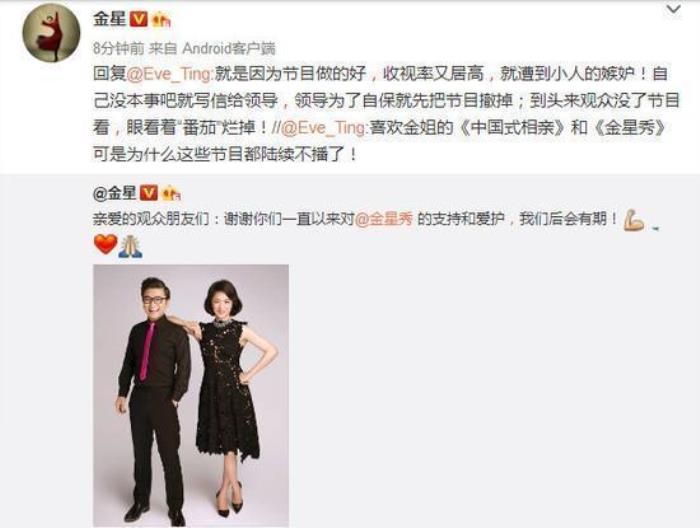 果然有内情,9月2日的时候,金星在微博曝光了原因。网友在宣布停播的微博下表示:“喜欢金姐的《中国式相亲》和《金星秀》,可是为什么这些节目都陆续不播了!”。金星则翻牌回答说:“就是因为节目做的好,收视率又居高,就遭到小人的嫉妒!自己没本事吧就写信给领导,领导为了自保就先把节目撤掉;到头来观众没了节目看,眼看着‘番茄’烂掉!”