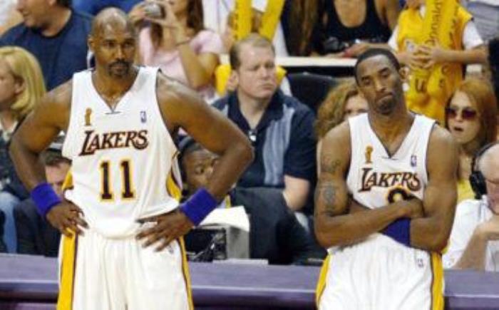 2004年11月23日,湖人主场对阵雄鹿,身上有伤的马龙坐在场下为湖人加油。