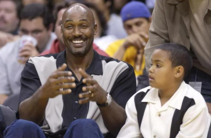 当时,马龙与他的儿子KJ坐在前排位置,而马龙的老婆凯则与瓦妮莎坐在球馆的另一边,隔了很远的距离。