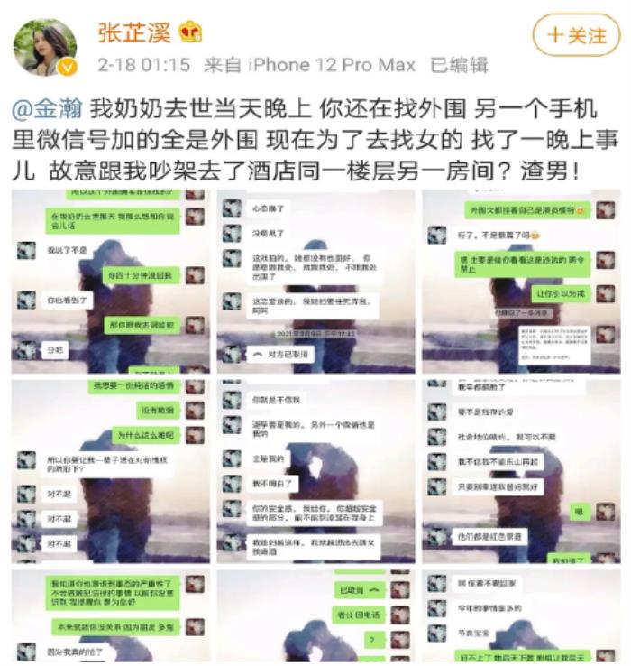 能主动曝光男方出轨的聊天记录,网友觉得特别过瘾,既吃到了瓜,又看到了娱乐圈的男明星有多渣男,张芷溪也已经把他锤得死死的,果断又狠辣的手段让张芷溪收获了“拽姐”的称号,大家也喊姐姐快逃,不要再被金瀚骗了。结果过了没几天,张芷溪就删掉了聊天截图,为金瀚开脱,说是自己搞错了。