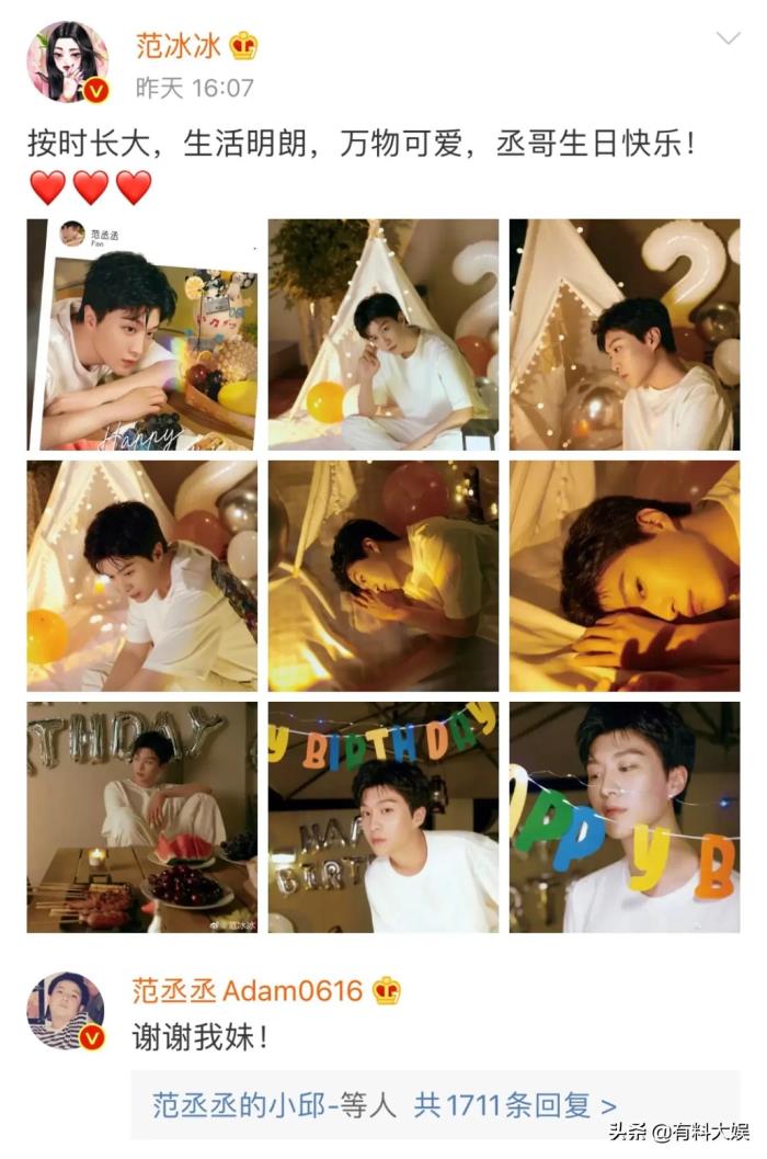 姐姐第一时间为弟弟发微博庆生,大胆称范丞丞为丞哥。然而弟弟更是在姐姐微博下留言感谢妹妹。一时间姐弟二人反转成个兄妹,评论区的焦点显然已经不是庆生了,却成了兄妹情。