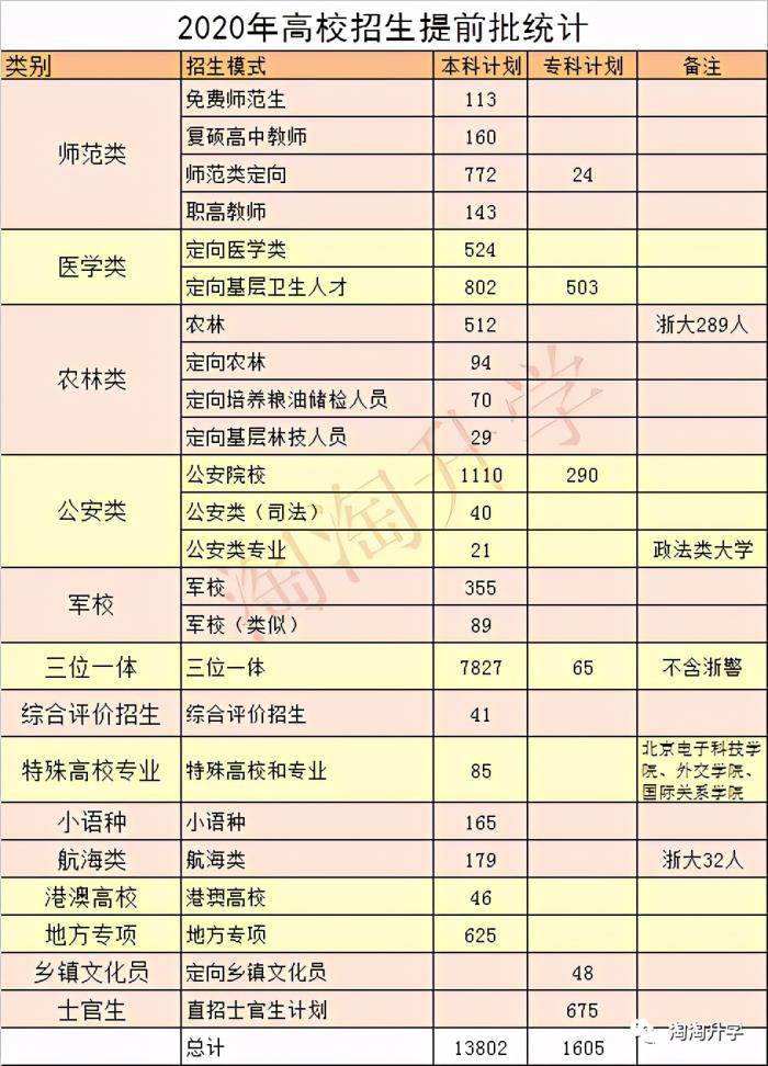 2020年浙江省普通类提前批招生,169所高校696种专业,招生计划15407人,其中提前批本科计划13802人,专科1605人。具体数据如下: