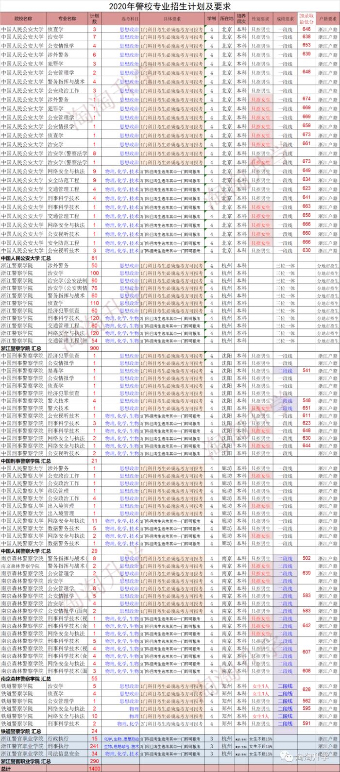 2020年警校在浙江省招生情况汇总
