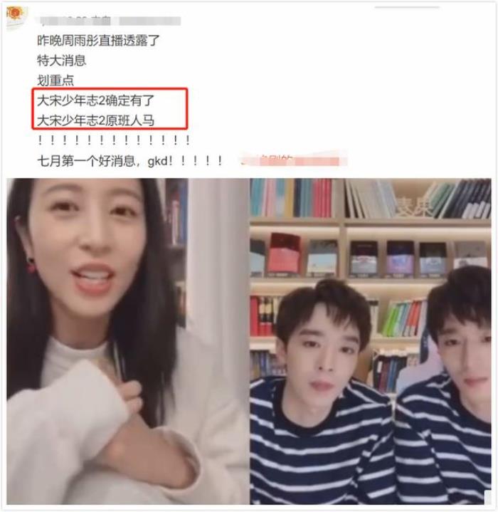 19年《大宋少年志》播出完成之后,喜欢他的粉丝们就纷纷期待续集的上映,而就在近日剧中女主赵简的饰演者周雨彤在直播中透露,大宋少年志2大家可以期待了,还是我们这群小伙伴,消息一出,粉丝欢呼雀跃,也算是终于安心了下来。续集有望,还是原班人马,还有什么比这个还要开心的事嘛?